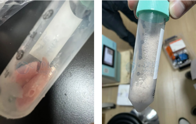 上圖為1分鐘的研磨效果,已經完全研磨完成。效果非常好,冷凍研磨儀一次可以研磨2個樣品,大大提高了之前用手磨的效率和效果,所以人工研磨特別不方便,經過多次了解和對比所以老師選用凈信冷凍研磨儀代替人工處理。效率高,效果好。解決了老師的研磨問題。