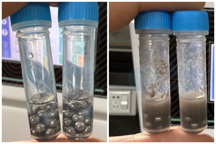 毛發樣品研磨前后對比,1分鐘內可以研磨到勻漿狀態