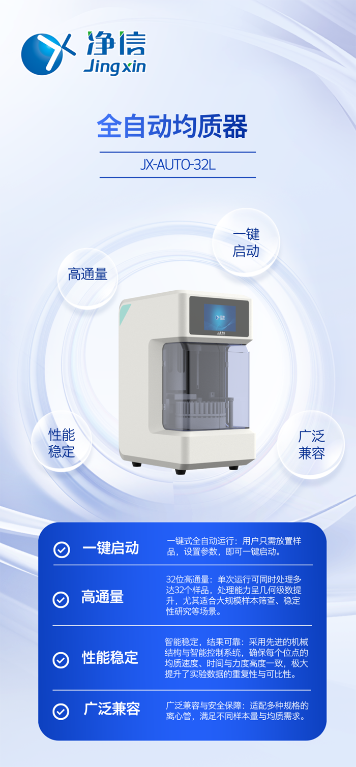 凈信JXAUTO-32L全自動均質器,不僅僅是一臺提升效率的設備,更是實驗室邁向標準化、自動化、智能化的重要一步。它通過取代重復性人工勞動、保證數據源頭的一致性、大幅提升科研產出速度,為研究人員贏得了寶貴的創新時間。在追求效率的時代,JXAUTO-32L正成為眾多質量控制、研發創新實驗室中不可或缺的得力助手。